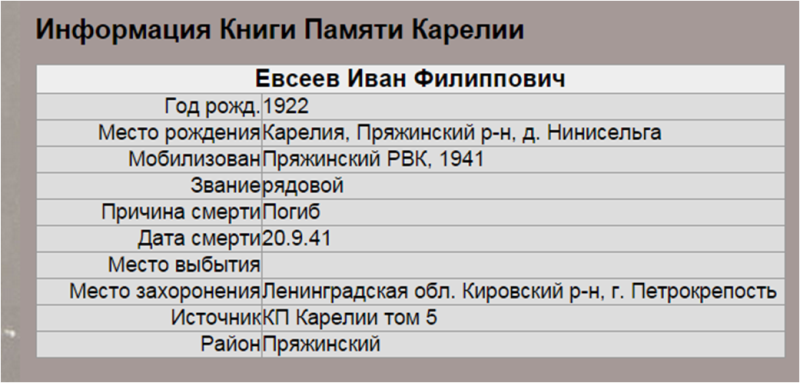 Призван в Советскую Армию Пряжинским РВК в 1941 году.