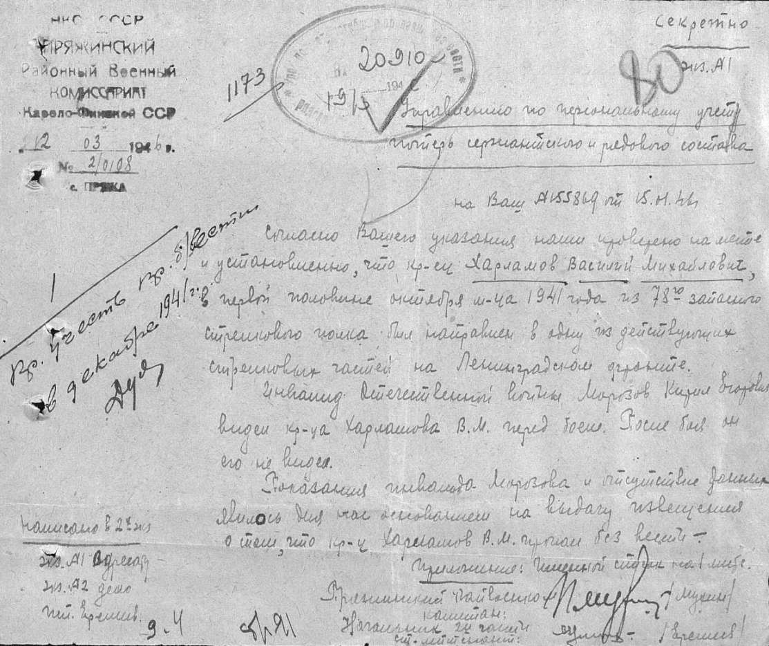 Призван в Советскую Армию в 1941 году Пряжинским РВК, рядовой.