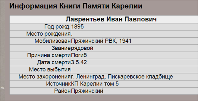 Родился в 1895 году в Заонежском р-не, с/с Вырочерский, д.Ивановкиева.