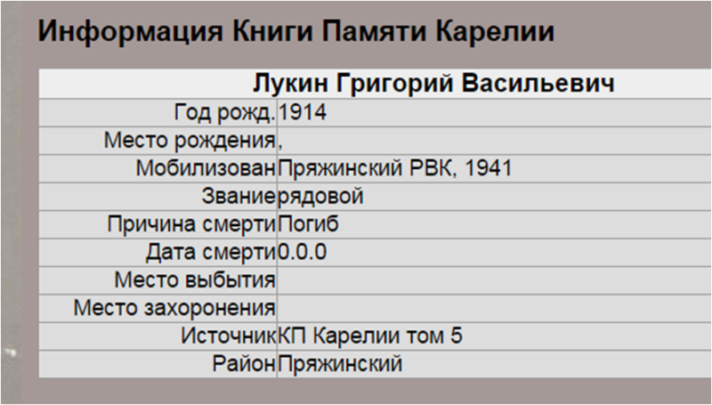 Призван Пряжинским РВК в 1941 году.