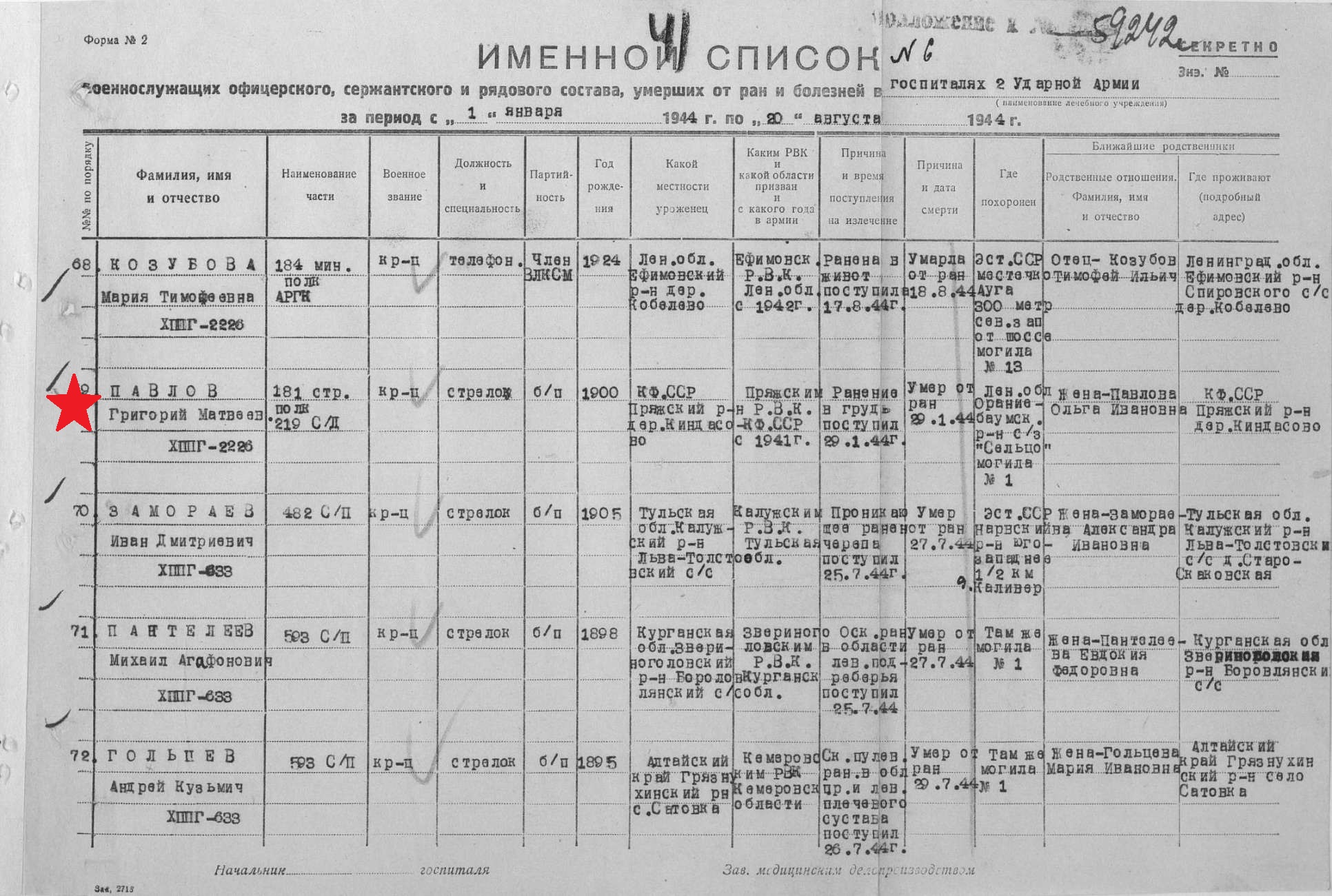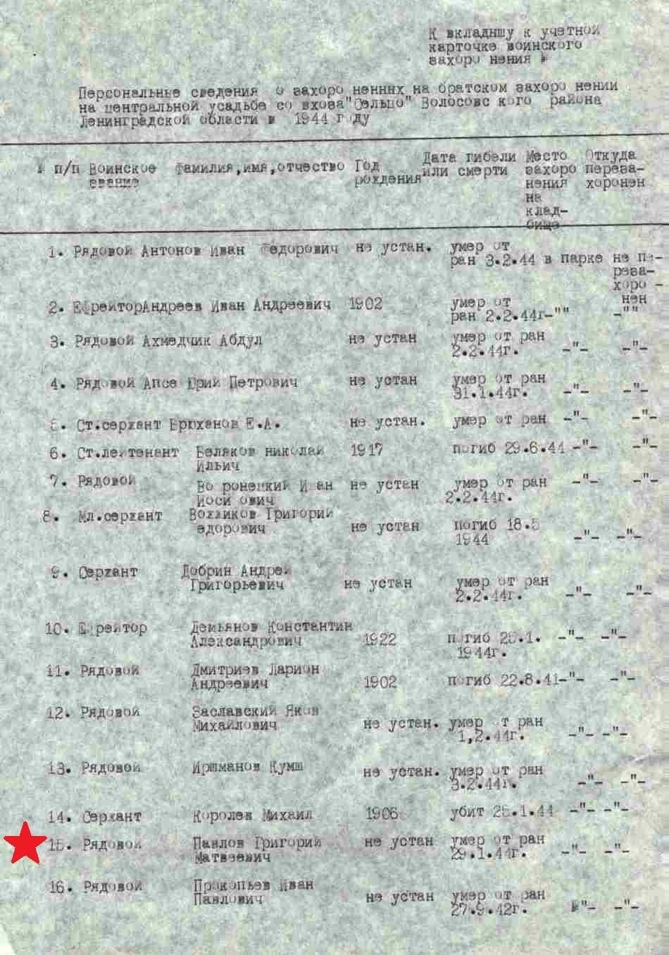 Умер от ран в госпитале 2226 29 января 1944 года.