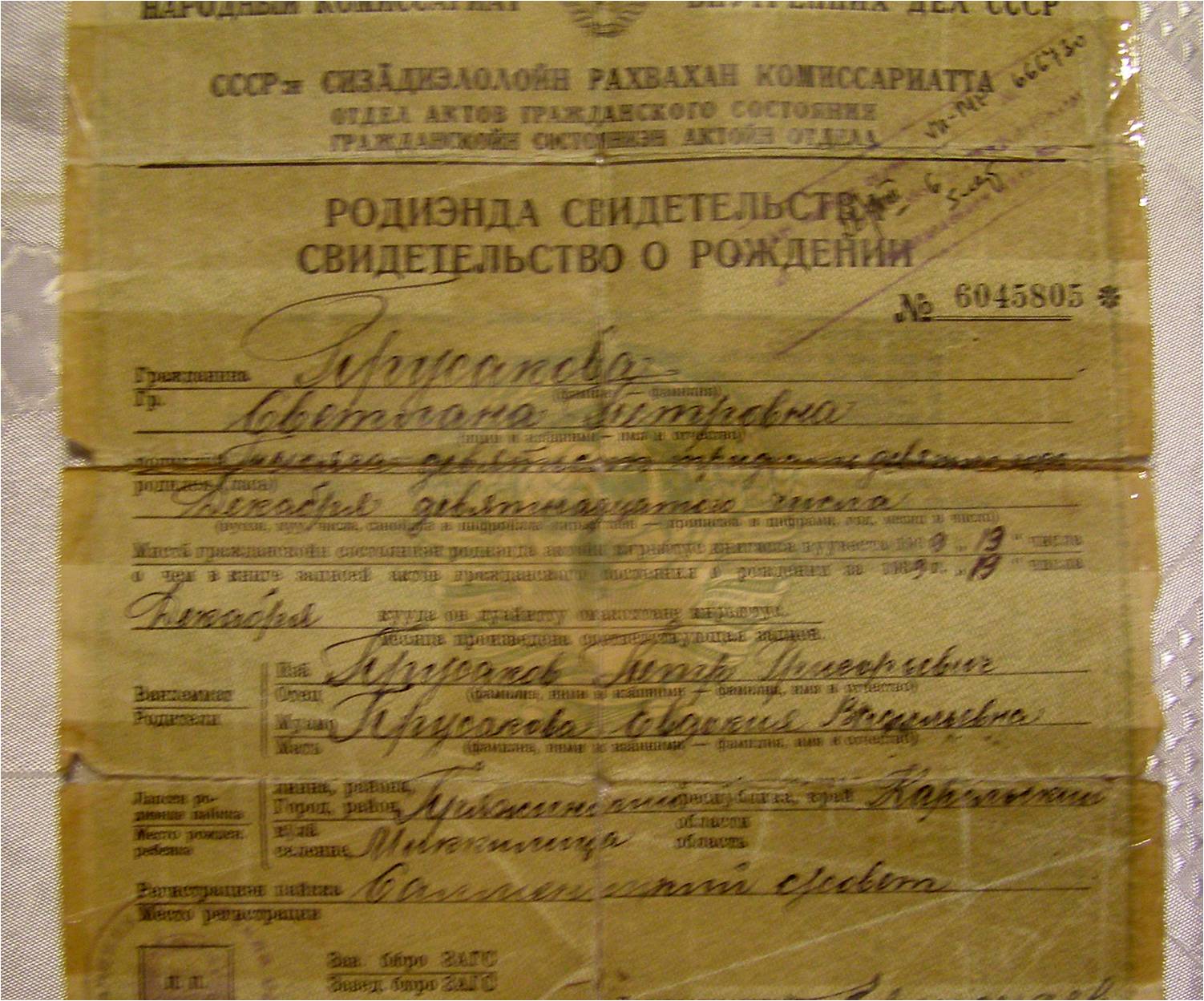«Когда началась война, мне было полтора года. Я смотрю на правнука, которому исполнилось 2 года, и думаю, что он бы смог сейчас понять и запомнить. Так и я ничего не помню об отце, Прусакове Петре Григорьевиче. По рассказам мамы, Евдокии Васильевны, родился он под Ведлозером, был сиротой, воспитывала его бабушка. Он учительствовал в начальной школе в Салменице около Эссойлы. В Салменице они поженились с мамой. Отцу было 22, маме 19. Свадьбу сыграли в мае 1937 года. Я родилась в Миккелице 19 декабря 1939 года. Папа решил назвать меня Светланой, сам записал моё имя в Свидетельстве о рождении. Я храню его как реликвию, ведь там почерк моего отца. Да, а мой почерк очень похож на его…