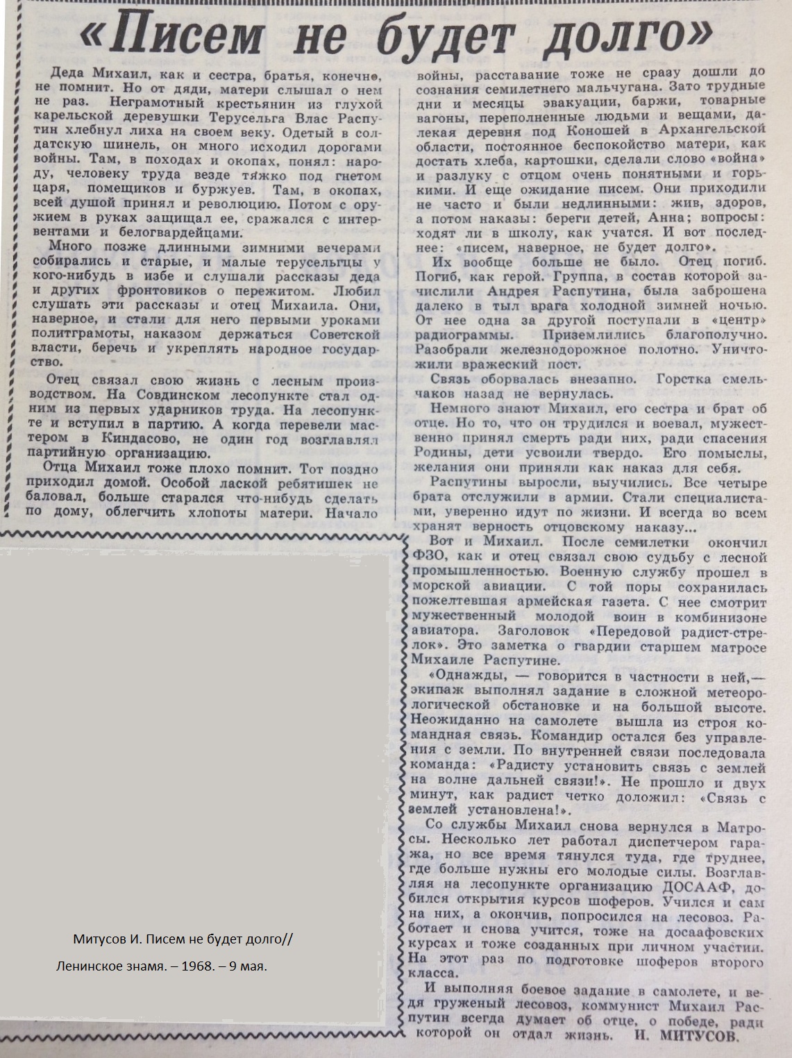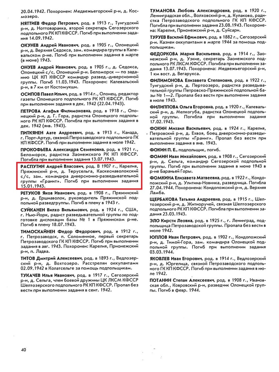 Как писала районная газета «Ленинское знамя» (9.05.1968), он «погиб как герой. Группа, в состав которой зачислили Андрея Распутина, была заброшена в тыл врага… От нее одна за другой поступали в центр радиограммы. Приземлились благополучно. Разобрали железнодорожное полотно. Уничтожили вражеский мост. Связь оборвалась внезапно. Горстка смельчаков назад не вернулась».