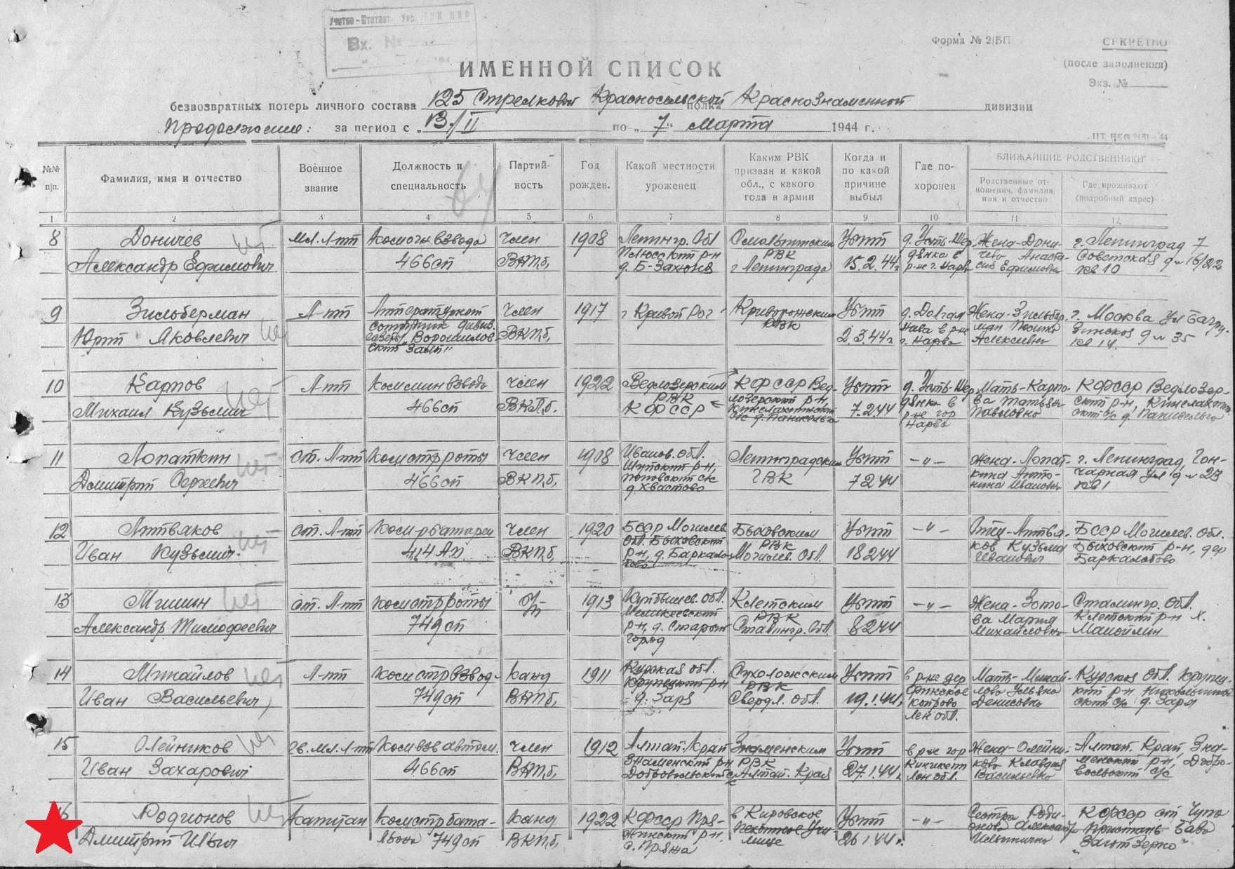 Призывался из Кировского пехотного училища (г. Киров, Кировская область).