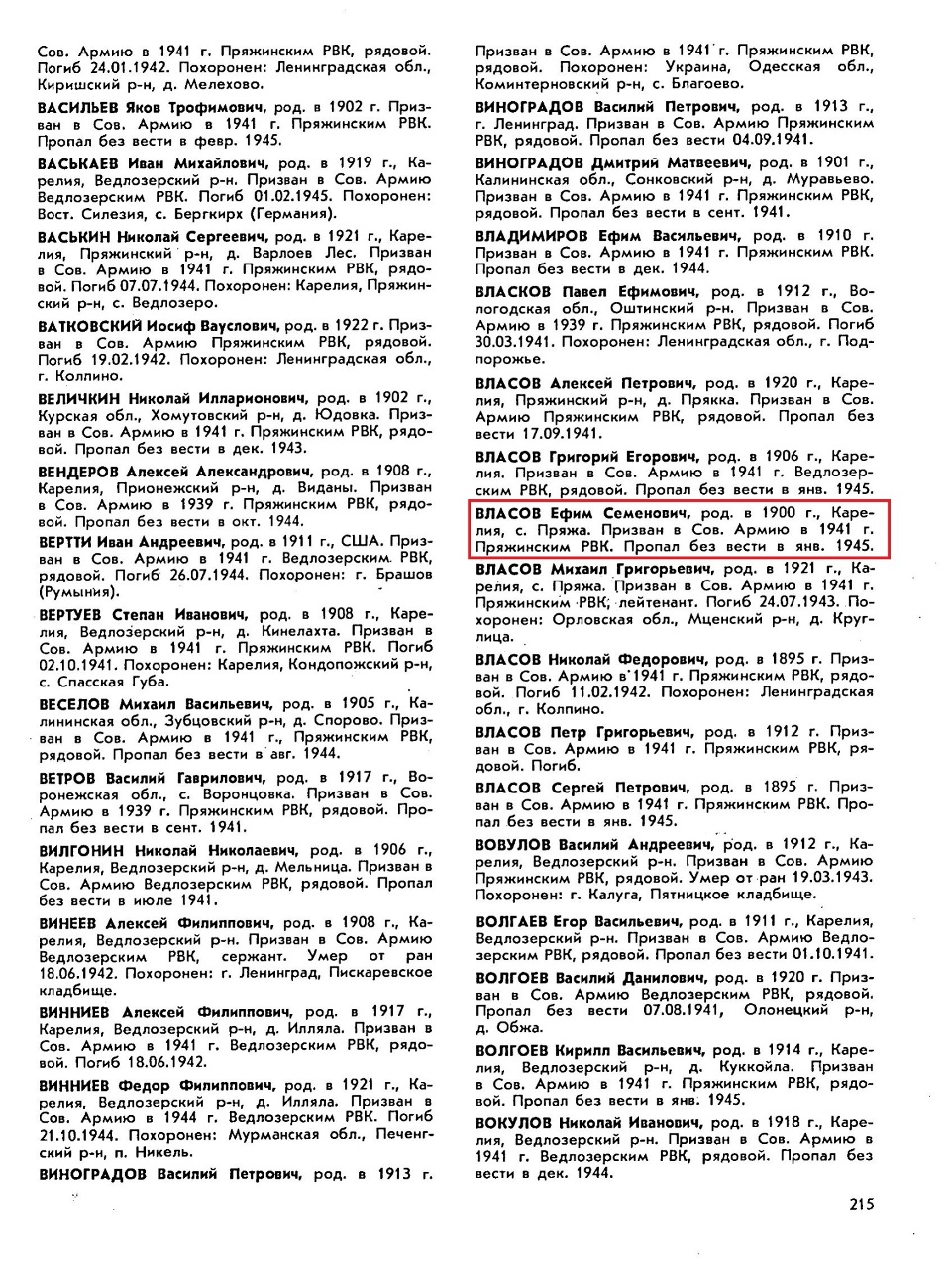 Призван Пряжинским РВК 2.08.1941 г., рядовой.