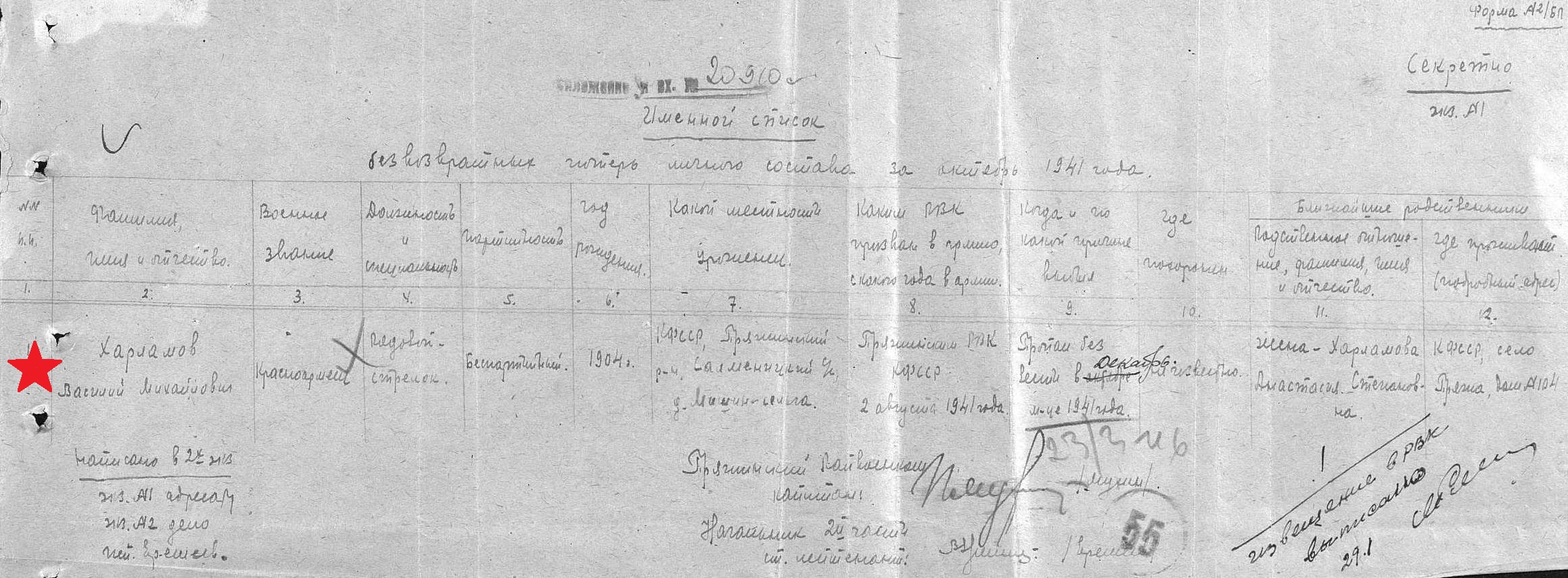 Призван в Советскую Армию в 1941 году Пряжинским РВК, рядовой.