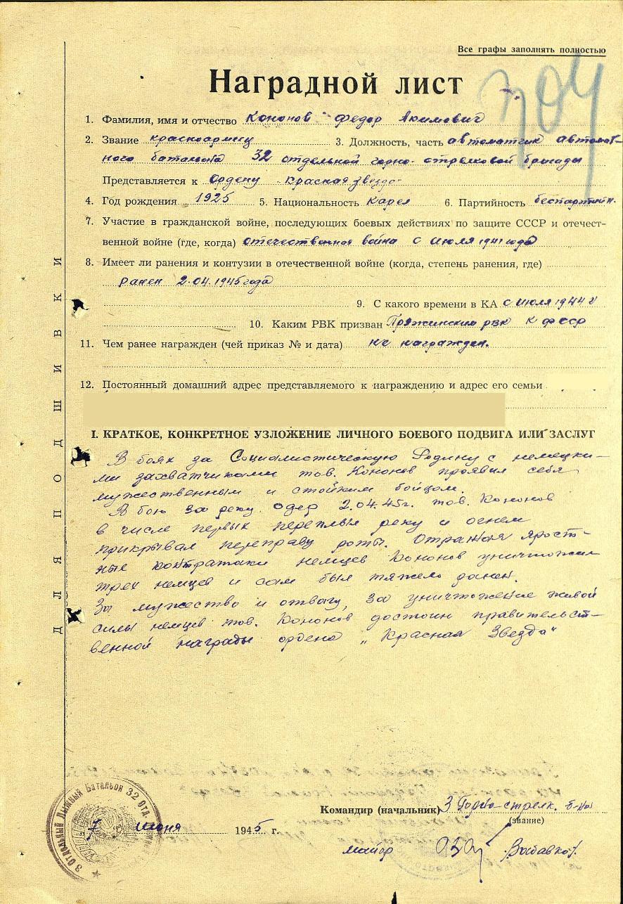 Призван в Советскую Армию Пряжинским райвоенкоматом в 1944 году.