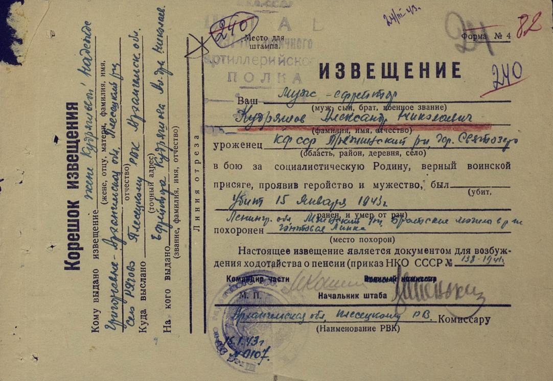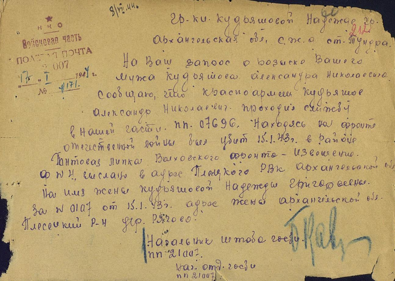 Извещение о смерти выслано жене Кудряшовой Надежде Григорьевне по адресу: Архангельская область, Плесецкий район, д. Рябово.
