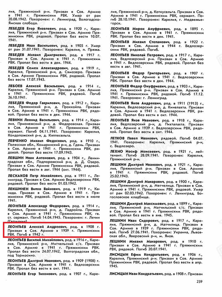 Призван в Советскую Армию в 1939 году Пряжинским райвоенкоматом.