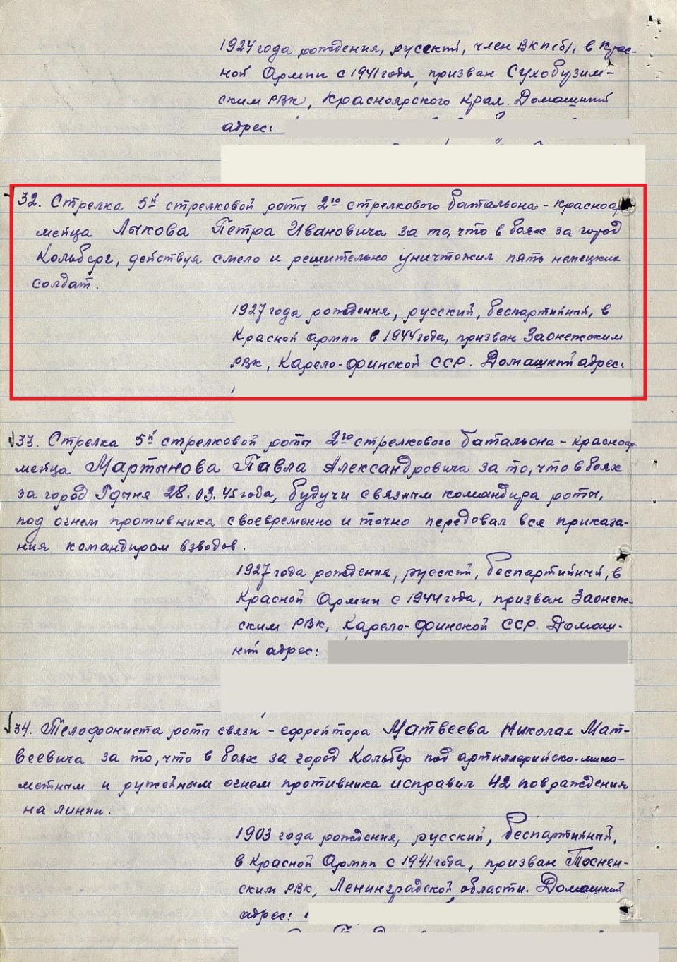 В боях за город Кольберг награжден медалью «За отвагу». В приказе по полку № 08-н от 28.05.1945г. записано: «Стрелка 5-й стрелковой роты 2-го стрелкового батальона Лыкова Петра Ивановича наградить за то, что в боях за город Кольберг, действуя смело и решительно, уничтожил пять немецких солдат».