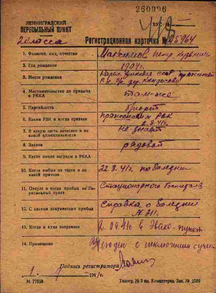 Призван в Советскую Армию 02 августа 1941 года Пряжинским РВК.