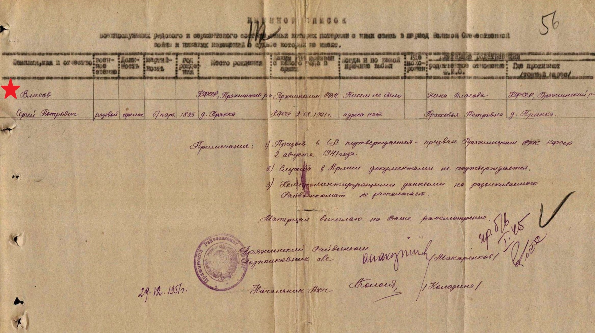 Жена – Власова Прасковья Петровна, проживала в д. Прякка.