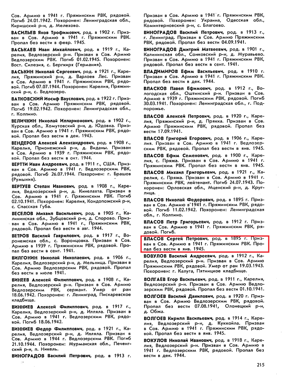 Призван Пряжинским РВК 2 августа 1941 г. Рядовой, стрелок.